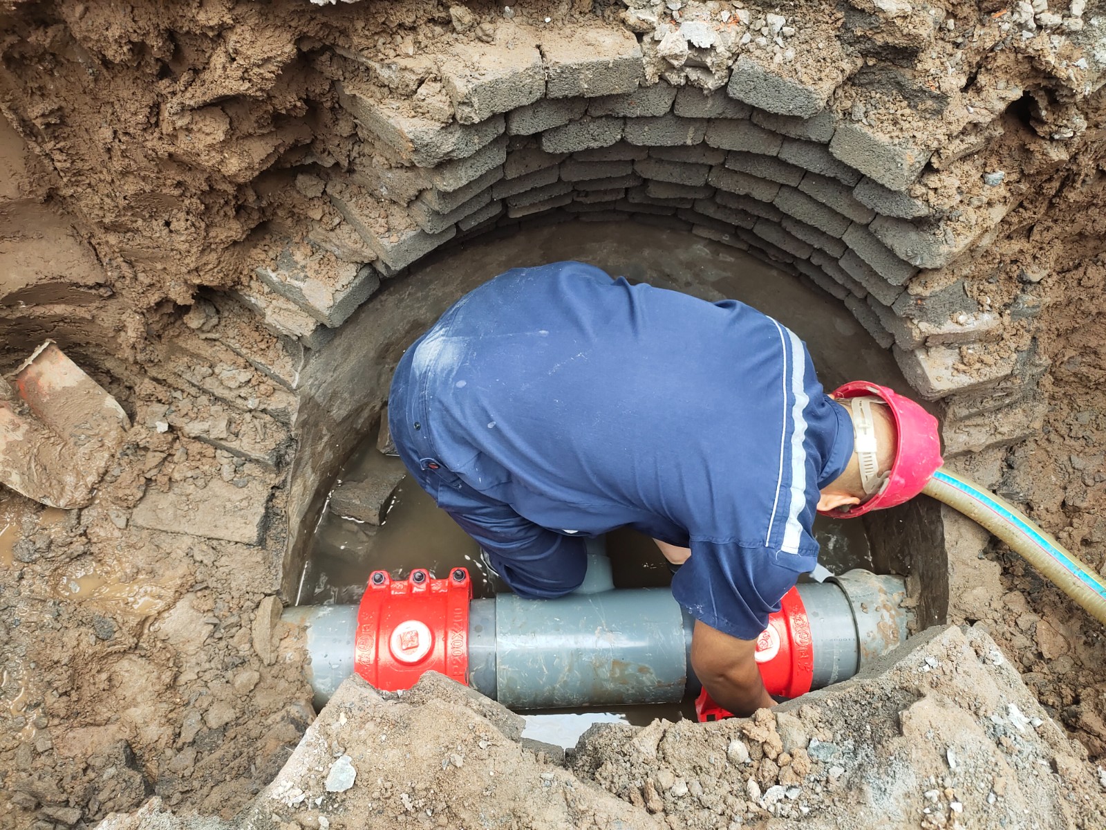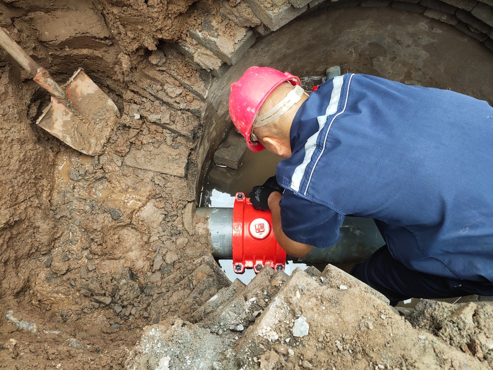 维修人员抵达现场后,第一时间对漏水点进行勘查,凭借丰富的经验和专业的技术,快速确定了漏点位置和受损情况。维修坑空间逼仄,仅容一人俯身操作。坑内泥水浑浊没至膝盖下,砖石土方环绕四周,维修人员在这方寸之地里半蹲甚至跪伏,专注于手中的管道部件。他们或在泥水浸泡中调试管件,或在狭小缝隙里拧紧螺丝,每一次操作都需克服空间的限制,每一个动作都要在泥泞中保持精准。经过奋战,终于成功修复了漏水管道,恢复了小区的正常供水。